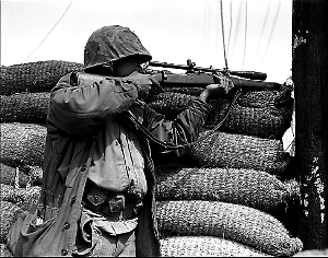 美军陆战队狙击手在战场上。